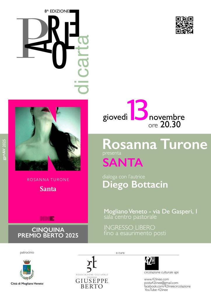 Santa è il suo romanzo d’esordio, selezionato nella cinquina finalista della XXXII edizione del Premio Giuseppe Berto 2025